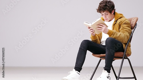 A teenager reading a novel while sitting on a chair, isolated on a pale lavender background