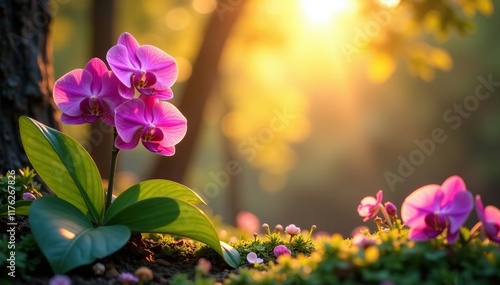 Golden light falls upon a serene orchid landscape, peaceful evening, whiteshade