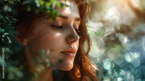 Serene Young Woman Pondering Surrounded by Lush Greenery and Soft Dappled Light in Atmospheric Nature Setting