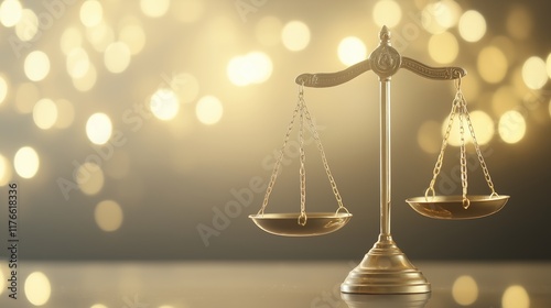 The floating golden scales of justice on the judge's table, courtroom background, law and justice concept, close-up view.