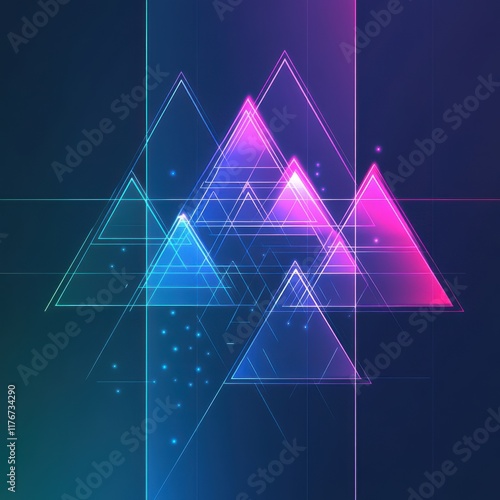 Colorful geometric shapes with vibrant pink and blue lighting against a dark background.