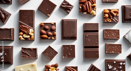 Assorted gourmet chocolate squares with varied textures and rich brown tones