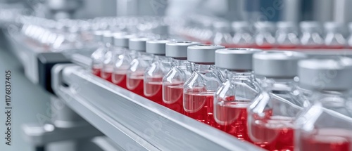 A production line filled with glass vials containing red liquid, showcasing a sterile environment typical of pharmaceutical manufacturing.