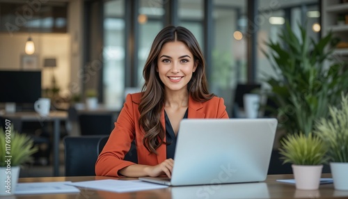 Confident and Composed: A professional businesswoman exudes confidence and composure as she works on her laptop, surrounded by the vibrant energy of a modern office space.
