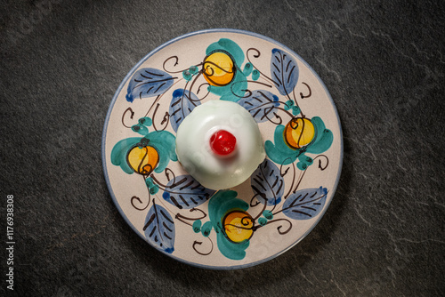 Traditional Sicilian cassata, sweet dessert cake with ricotta and candied fruits on typical ceramic plate