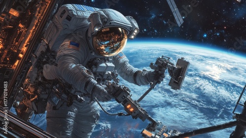 An astronaut in a spacesuit performs maintenance work on a space station while the Earth glimmers below in the distance during daylight hours