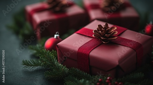 Three maroon Christmas presents wrapped with decorative pine cones and red ribbon, nestled amongst festive greenery and ornaments.