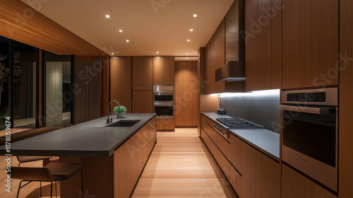 Moderne Küche mit elegantem Holzdesign und warmem Licht