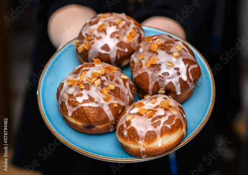 Tradycyjne polskie pączki nadziewane różą polane słodkim lukrem z kandyzowaną skórką pomarańczową