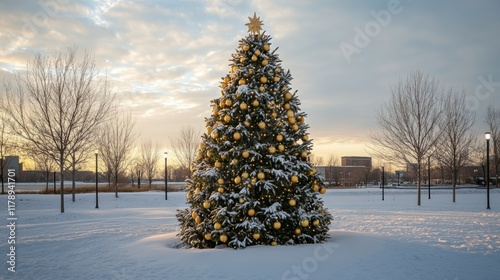 Beautifully decorated Christmas tree in a snowy park at sunset