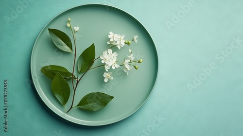 Zen-inspired flatlay, pristine circular plate, emerald green leaves, dainty white blooms, seafoam colored surface, nature-inspired styling, professional product photography, soft natural lighting,