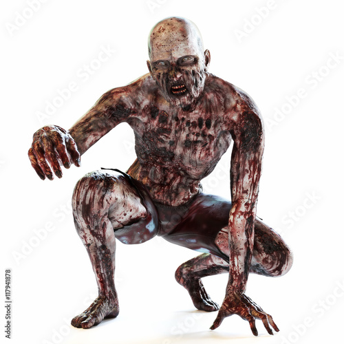 Zombie bloodthirsty undead posing on a white isolated background. 3d rendering