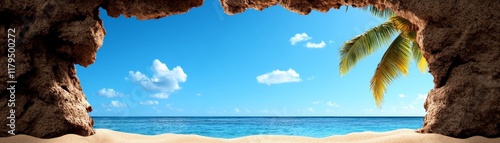 A Glimpse of Paradise: A tropical beach paradise peeks through the opening of a rocky cave, inviting viewers to imagine the serenity and beauty that lies beyond.