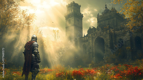 A lone knight stands in a field of flowers, gazing towards a majestic castle bathed in the golden light of sunset. This epic fantasy scene evokes fee
