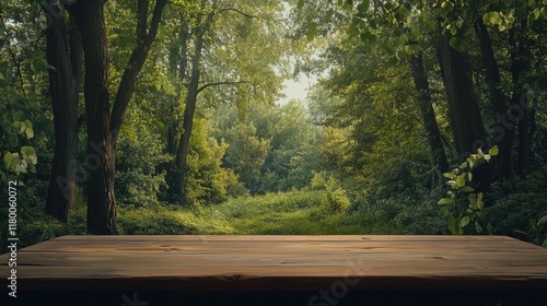 Piękny widok na las, z drewnianym stołem w pierwszym planie, na którym spoczywa natura, a w tle widać gęste, zielone drzewa.