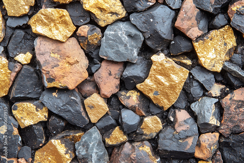 Detailed texture of variously colored stones, including metallic gold pieces. Perfect for geology or scenic texture design backgrounds.