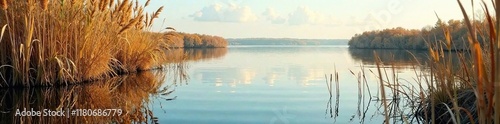 Chesapeake Bay's calm surface reflects the tall reed stalks above, leaves, bay