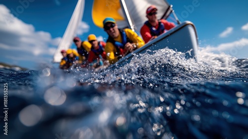 A vibrant crew passionately working together on a sailboat, showcasing the spirit of teamwork and adventure under a bright blue sky filled with fluffy clouds.
