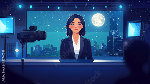 Female tv news anchor presenting news on mainstream local media. concept media reporting, female empowerment, journalism ethics, broadcast professionalism, news anchoring. Moonstream. Illustration