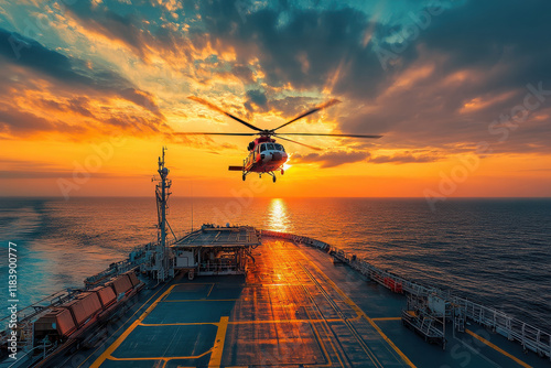 Helicopter flying over a ship at sunset, showcasing maritime operations.