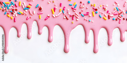 Pink cream with colorful sprinkles dripping down from top , isolated on white background