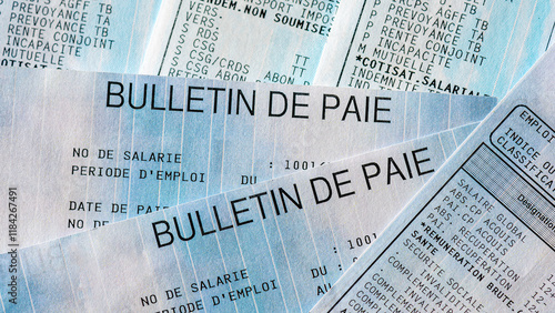 Plusieurs bulletins de paie français, avec quelques-unes des nombreuses lignes des cotisations et contributions sociales payées par les salariés et les employeurs en France