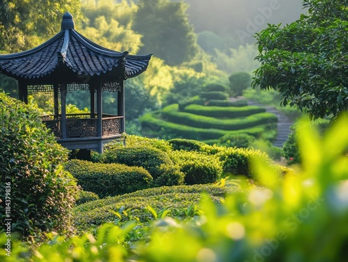 Ancient Chinese tea gardens, showcasing the origin of rare and unique tea leaves, tranquil and lush