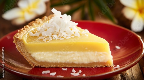 Coconut Custard Pie with creamy coconut custard filling and a golden crust, presented on a rustic red plate, tropical and smooth Hyper-quality professionnal photography