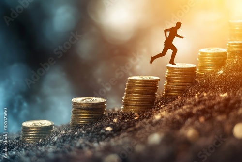 business success - creative concept of a person running up a digital ladder made of coins and currency, symbolizing the hustle for financial growth, minimal background with copy space