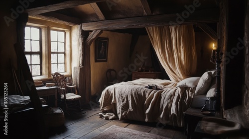 Rustic Tudor Bedroom Interior, Candlelight, Cozy, Old-World Charm