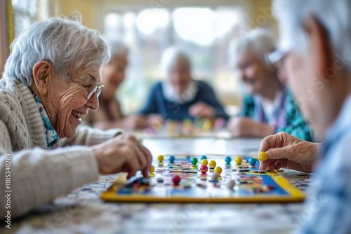 Group of senior friends enjoying board games together, concept of friendship and joy