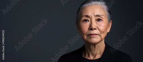 Asian senior woman with serious expression in studio setting with neutral gray background and large empty space for text left side, portrait shot.