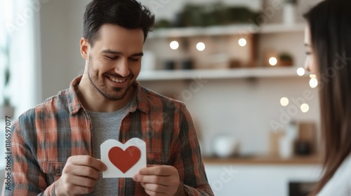 A Heartfelt Gesture: A young man, dressed in a casual plaid shirt, beams with joy as he holds up a red heart card, looking at a woman just out of frame. The image conveys warmth, love, and romance.
