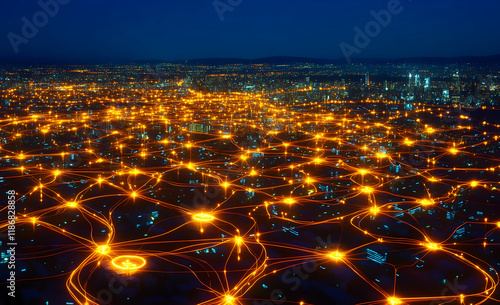 A wide-angle view of the city at night, with glowing network connections linking buildings across the landscape.