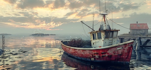 Rustic fishing boat at sunset, docked near a small shack by the calm sea.