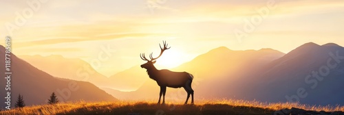 Majestic Elk at Sunrise - A majestic elk silhouetted against a vibrant sunrise, symbolizing freedom, wilderness, peace, serenity, and the beauty of nature.