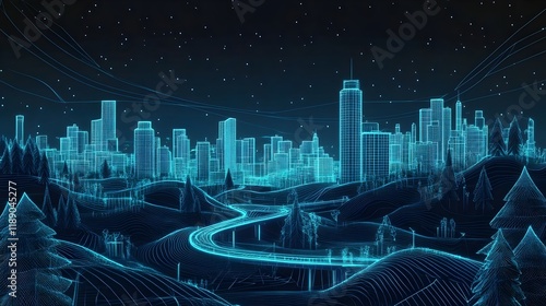 Futuristic cityscape on a dark background.A glowing wireframe modern cityscape at night. futuristic urban planning, smart cities, or digital city models. integration of nature with modern architecture