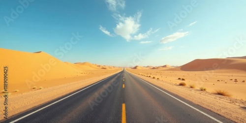 Asphalt ribbon cutting through endless golden sand dunes under a vast, clear sky