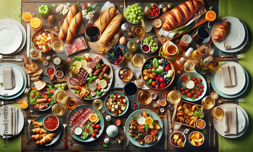 Festliche Tafel, üppig gedeckter Tisch mit Speisen und Getränken, flatlay