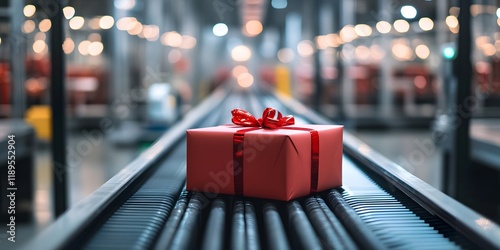 A red gift box on a conveyor belt in an automated fulfillment center during the christmas season, symbolizing efficient holiday logistics, Generative Ai