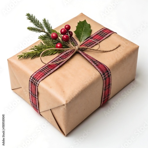 A neatly wrapped gift box with kraft paper, plaid ribbon, twine bow, evergreen sprig, red berries, and holly leaf on a white background.