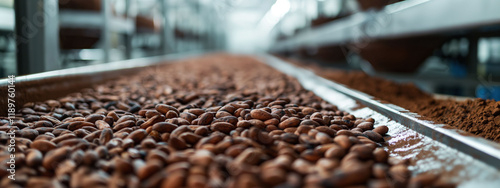 Roasted cacao beans in motion for sustainable chocolate production in a minimalist factory environment