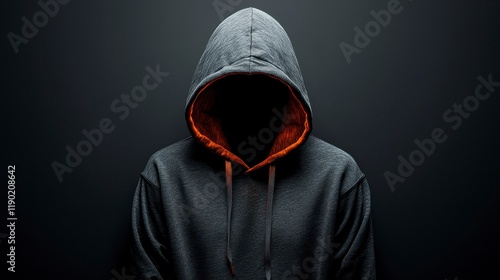 Faceless person in a dark grey hoodie with an orange lining against a black background.