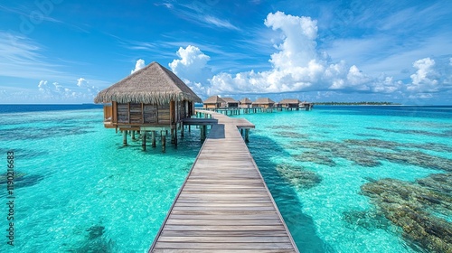 An aerial view captures the stunning beauty of a Maldives island, showcasing luxurious water villas and a wooden pier set against the vibrant colors of a breathtaking sky.