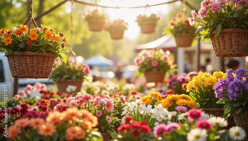 Colorful hanging flower baskets in sunny market, spring celebration, Hanging Flower Baskets Day