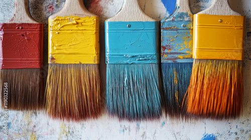 Painting works and home repairs, renovation of interior design. Vector retro brush and paint, matching colors and textures. Redecoration tools, equipment or material, building store, painting service