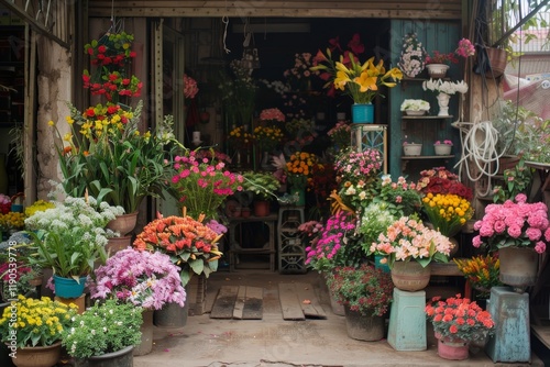A colorful flower shop overflowing with blooms, showcasing the beauty and fragrance of nature, A flower shop with vibrant blooms and a fragrant aroma
