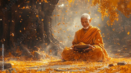 Serene Monk Meditates Amidst Falling Autumn Leaves