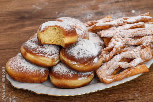 Pączki i faworki na tłusty czwartek na talerzu z bliska