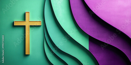 Engaging contemporary modern Christianity background. Cross, gold magenta green, geometric, copy space for church notices, youth ministry, clubs, correspondence, website, Christian evangelism